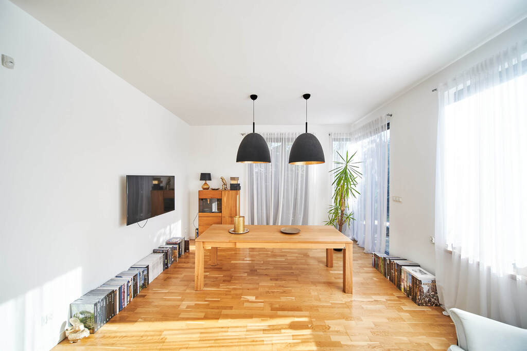 Wysoki standard wykończenia – naturalne materiały, dębowe podłogi, drewniane okna, kuchnia ze sprzętem premium.