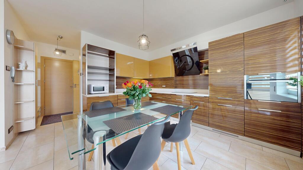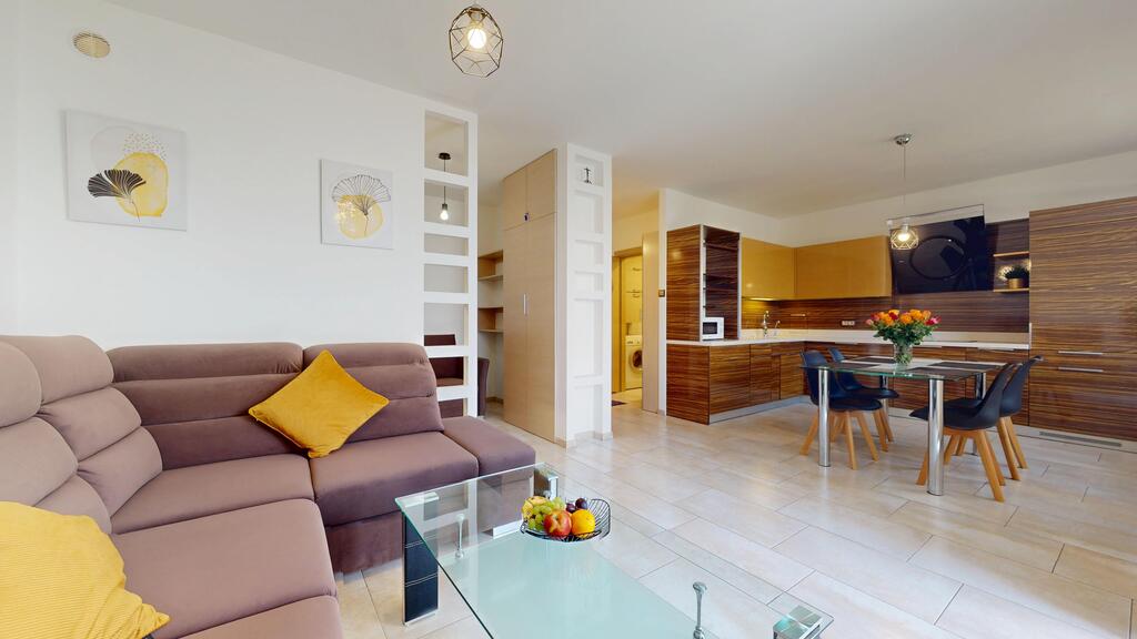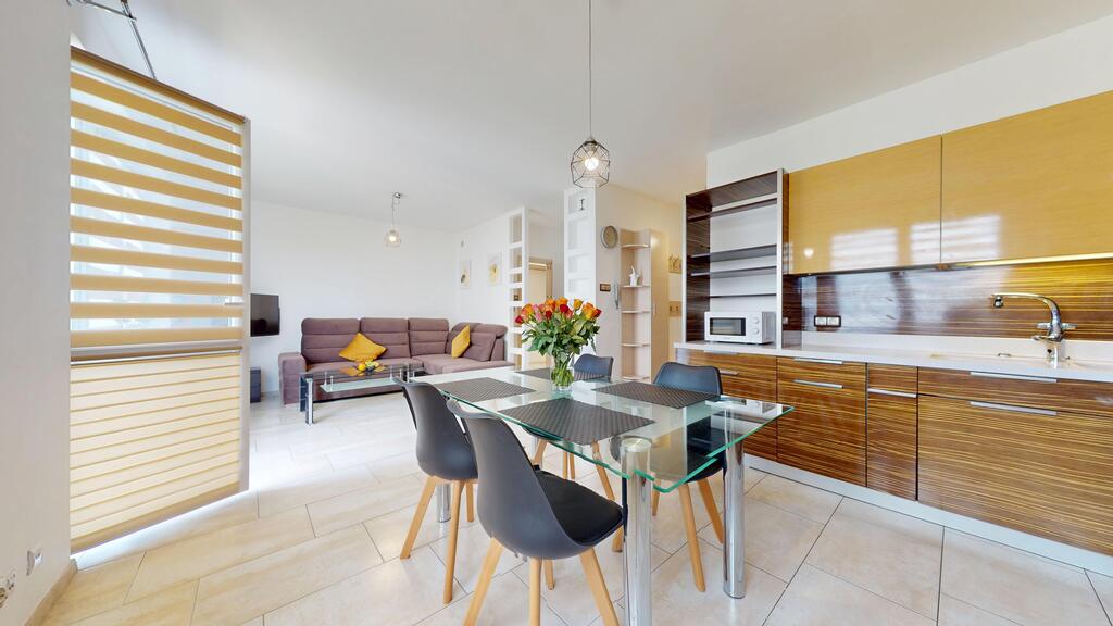 Apartament jest kompletnie wyposażony. W kuchni znajdują się meble wykonane na wymiar ze sprzętem AGD w zabudowie (lodówka, płyta indukcyjna, okap, zmywarka, piekarnik) oraz stół z krzesłami. W salonie narożnik i stolik kawowy, zaś w sypialni kanapa dwuosobowa, szafa oraz półki. Garderoba wyposażona jest w funkcjonalną zabudowę, złożoną z półek, szuflad i wieszaków. Łazienka posiada kabinę prysznicową, wc, umywalkę z szafką i pralkę z zabudową. W korytarzu został zabudowany na wymiar i znajduje się w nim dużo miejsca do przechowywania odzieży itp.