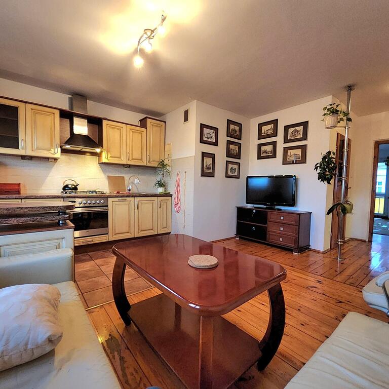Do wynajęcia mieszkanie 3 pokojowe usytuoawane na 4 piętrze 5-piętrowego bloku. Na powierzchni 64m2 znajdują się : salon z aneksem kuchennym o łącznej powierzchni ok 20m2, duża sypialnia z wyjściem na balkon, mniejszy ok 10m2 pokój oraz łazienka z wc. W mieszkaniu znajduje się dużo pojemnych szaf. Jest ono wpełni wyposażone w meble i sprzęt AGD ( pralka, lodówka, zmywarka, TV ). Ściany malowane, na podłodze deska drewniana i terakota, okna PCV. Mieszkanie jest bardzo ciepłe i przytulne.