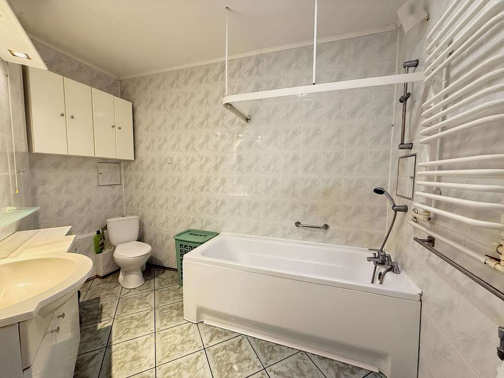 Duża łazienka razem z wc, z wanną, w glazurze i terakocie.