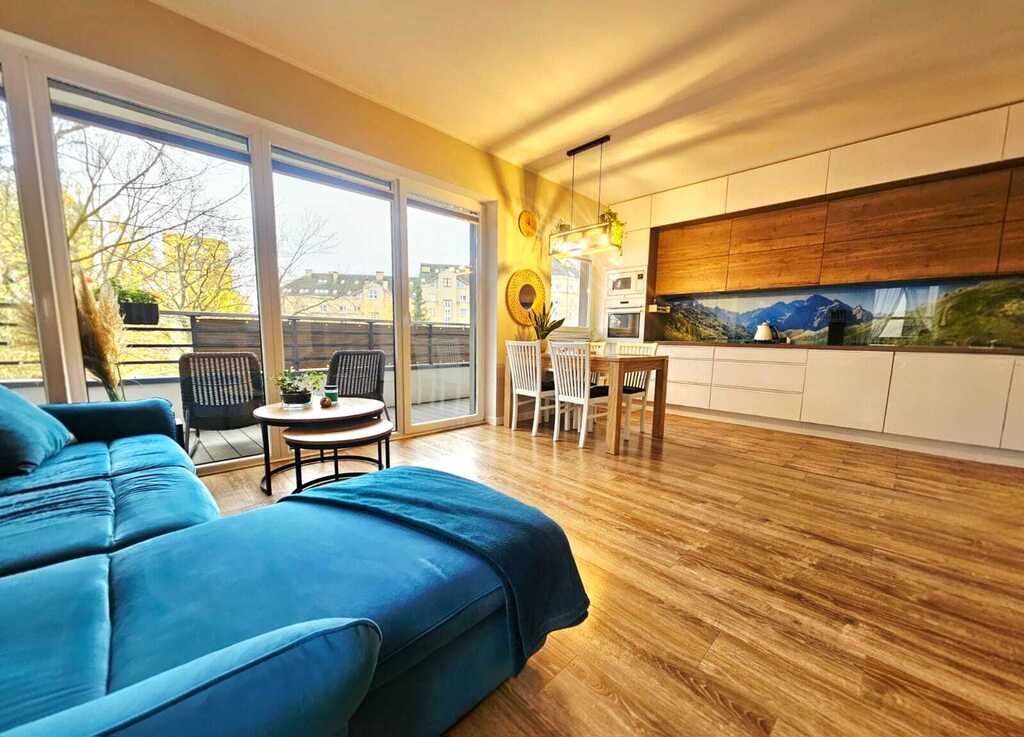 przestronne, jasne i słoneczne, komfortowo wykończone 3. pokojowe mieszkanie, usytuowane na 6. piętrze nowoczesnego apartamentowca z 2018 roku z windą.