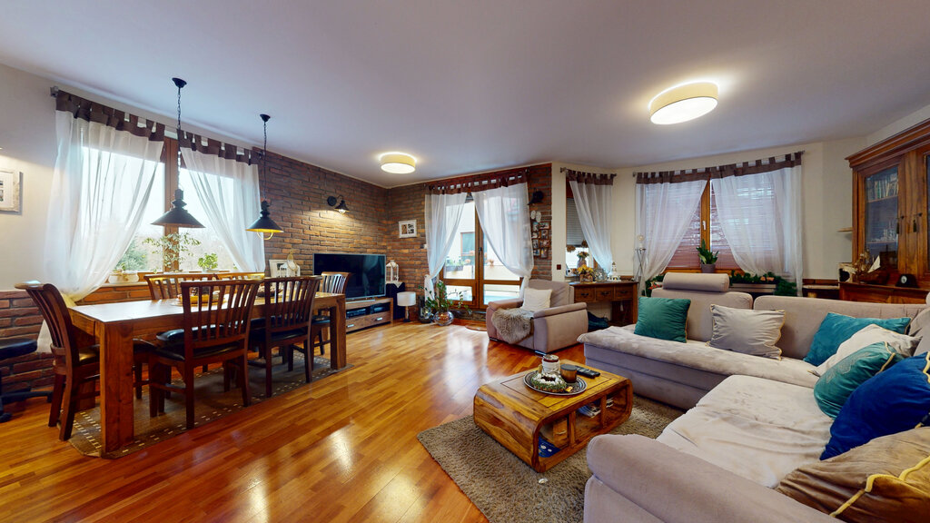 - duży salon z jadalnią, otwartą kuchnią i wyjściem na duży taras z markizą
