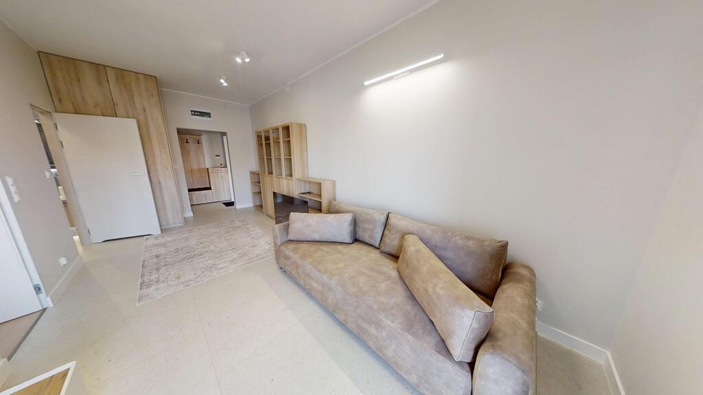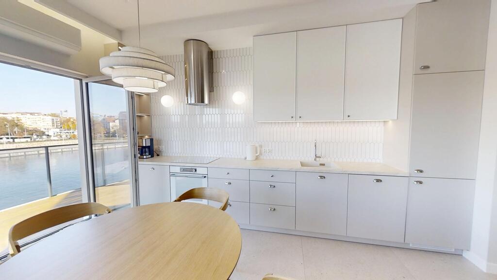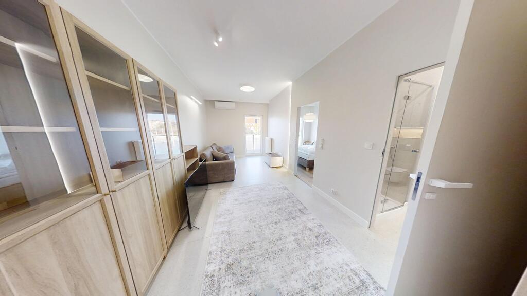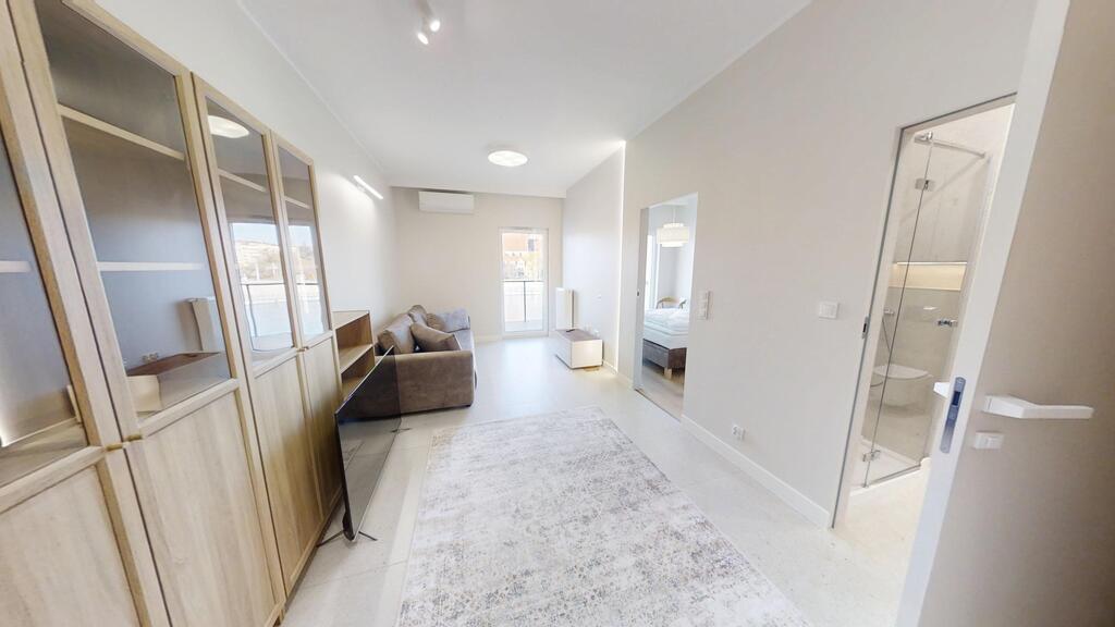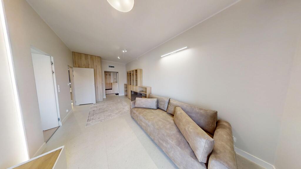• Przestronny salon z aneksem kuchennym – centralna część apartamentu, z panoramicznymi oknami, wyjściem na loggię i imponującym widokiem na miasto. Strefa wypoczynkowa wyposażona w zabudowę RTV , oświetlenie LED oraz system nagłośnienia.
