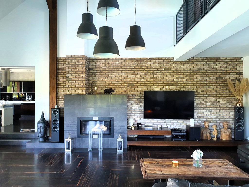 · Salon 67 m2 z kominkiem i wyjściem na taras dający poczucie przestrzeni