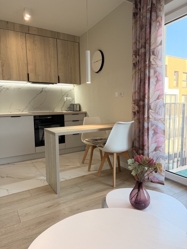 Mieszkanie znajduje się na 6. piętrze i zostało zaprojektowane z dużym wyczuciem stylu – wszystkie meble wykonano na wymiar, dzięki czemu wnętrze jest nie tylko nowoczesne, ale też wyjątkowo funkcjonalne. Jasny salon z rozkładaną sofą tworzy przytulną strefę wypoczynkową, a wydzielona część jadalniana doskonale sprawdza się do codziennych posiłków lub pracy przy laptopie. Aneks kuchenny został w pełni wyposażony w sprzęt AGD w zabudowie – zmywarkę, płytę, piekarnik i lodówkę. W łazience znajduje się prysznic oraz pralka, a pojemna szafa w zabudowie zapewnia dużo miejsca do przechowywania. Z salonu można wyjść na przestronny balkon z przyjemnym widokiem, idealny na poranną kawę lub wieczorny relaks.