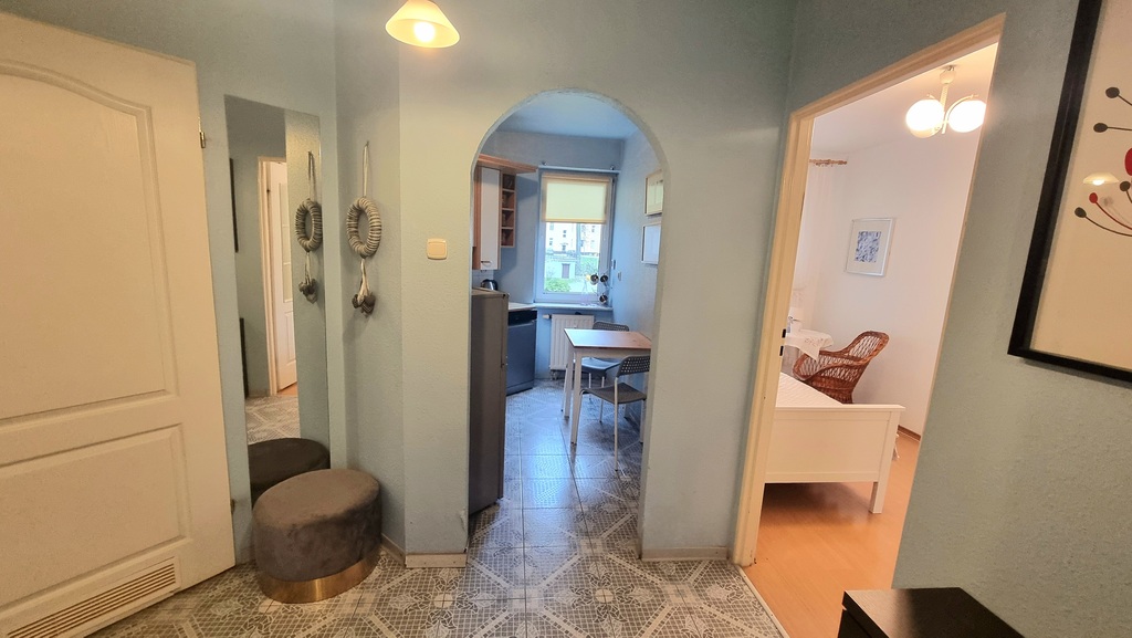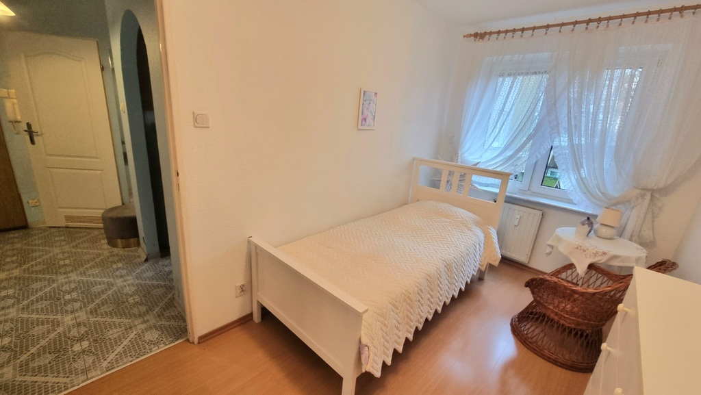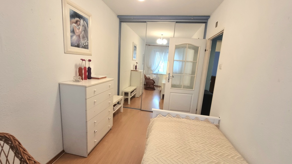 • Sypialnia: Przytulna, wyposażona w łóżko oraz pojemną, lustrzaną szafę typu Komandor, zapewniającą doskonałą organizację garderoby.