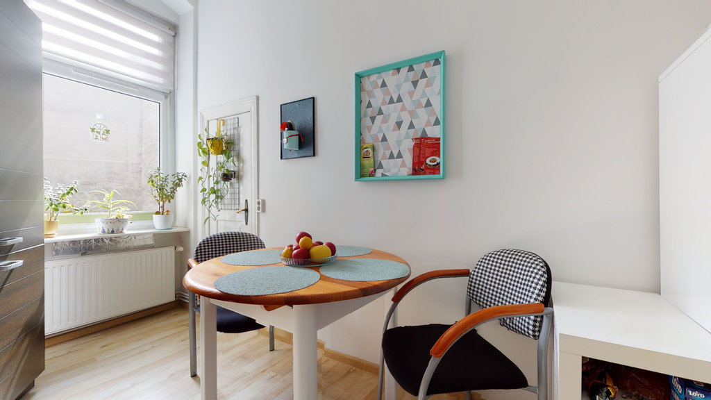 Mieszkanie znajduje się w ścisłym centrum, jednak ulica jest zielona, cicha, a widoku nie ograniczają kamienice. Dwie przecznice dalej znajduje się już deptak Bogusława, natomiast tyle samo dzieli nas w drugą stronę od Jasnych Błoni.