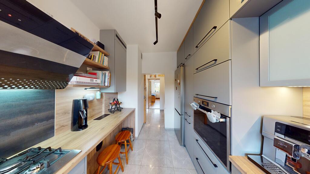 - oddzielna kuchnia z piękną, nowoczesną zabudową na wymiar aż do sufitu,