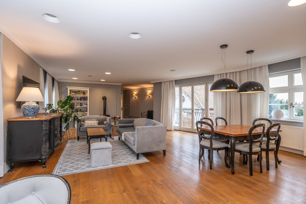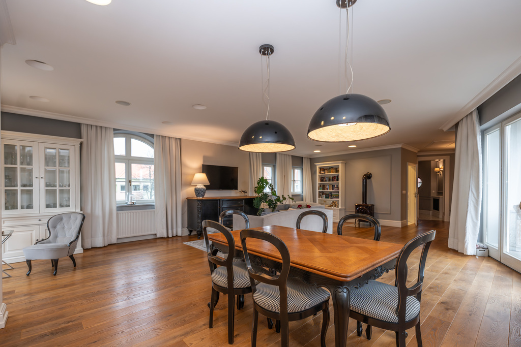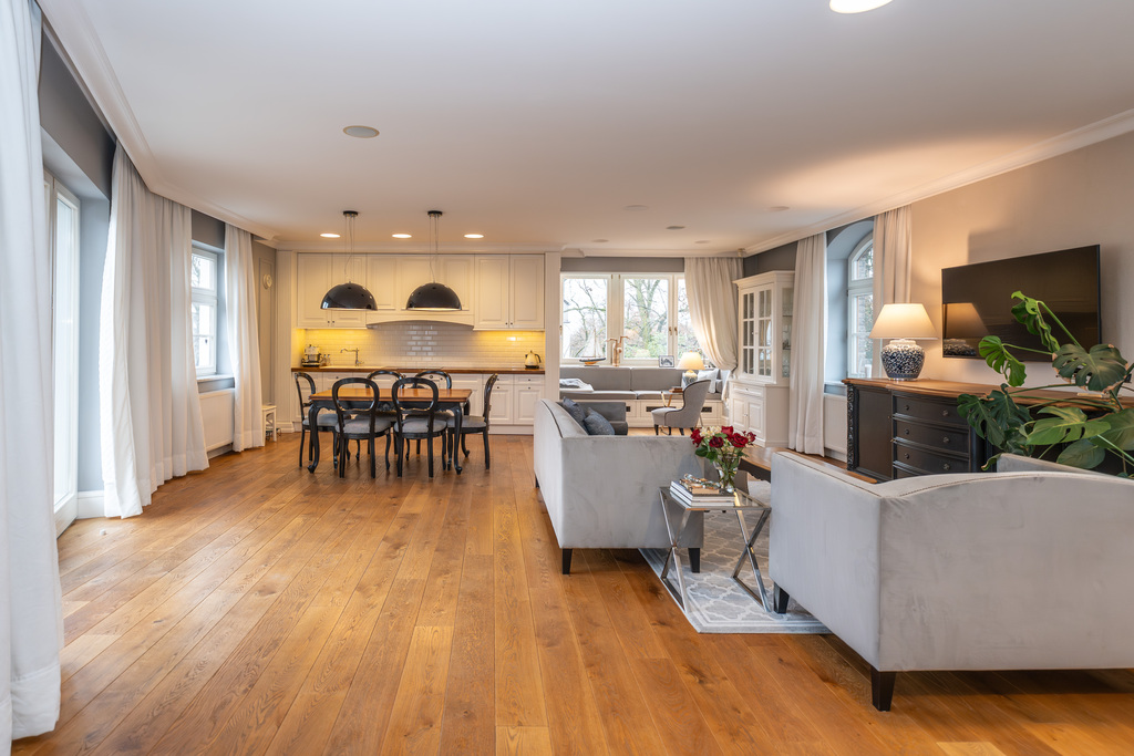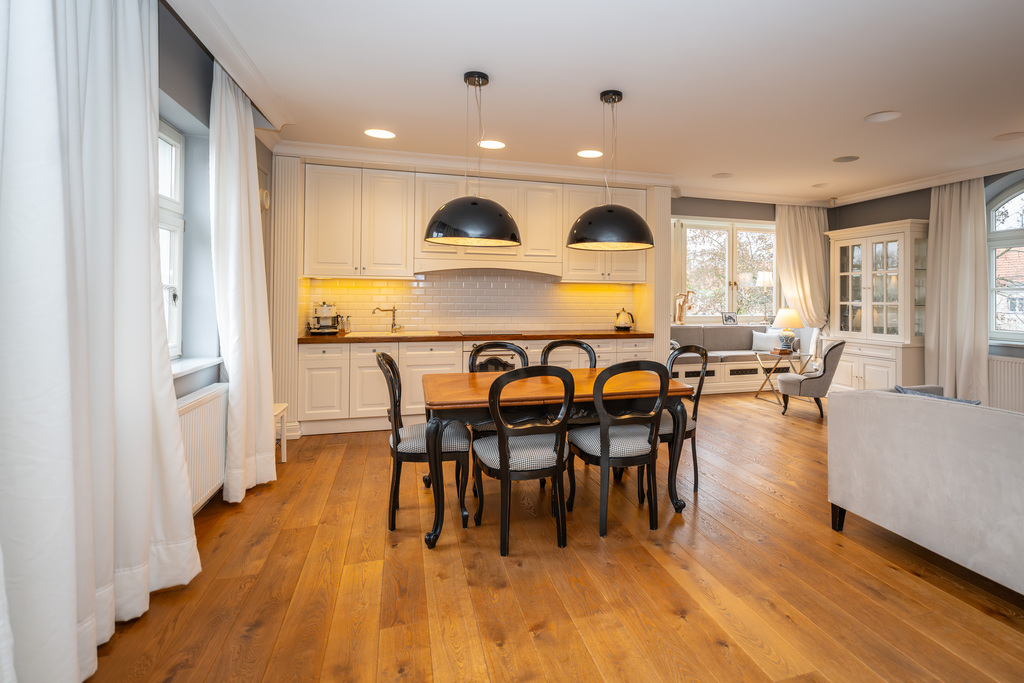 To wnętrze, które zachwyca dbałością o detal i ponadczasową klasą. Dominuje piękna, olejowana deska dębowa na podłogach, wysokie listwy przypodłogowe, sztukaterie ścienne i sufitowe, klasyczne proporcje pomieszczeń. Szaro-beżowa paleta barw przełamana głęboką zielenią i czernią, welurowe sofy, żyrandole w stylu glamour, kominek wolnostojący w salonie. Kuchnia otwarta na jadalnię w bieli i drewnie,. Łazienki wykończone marmurem i mozaiką w stylu retro (wanna wolnostojąca na lwich łapach,  baterie w chromie.