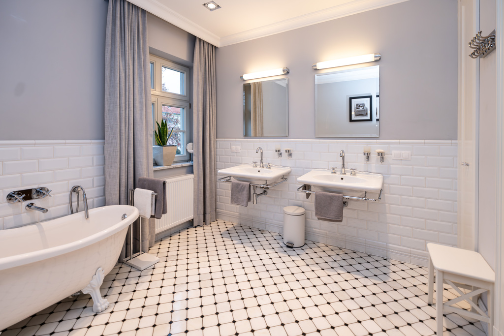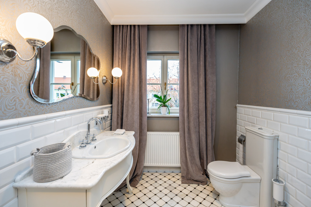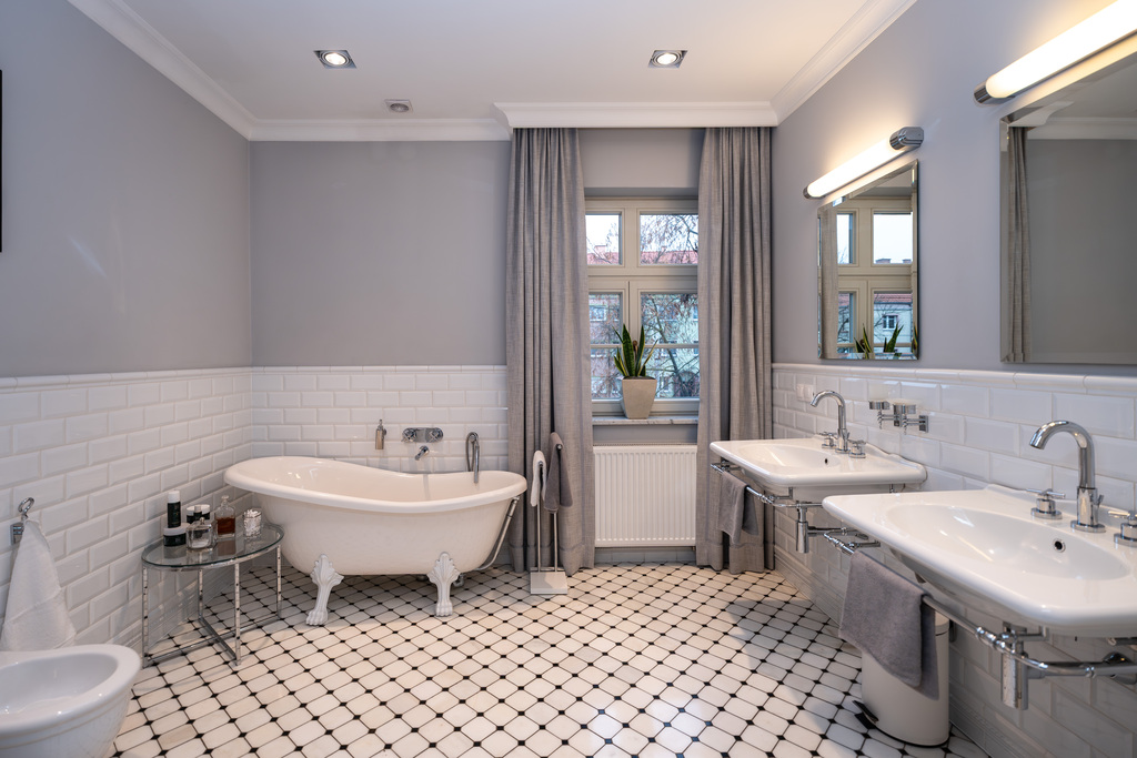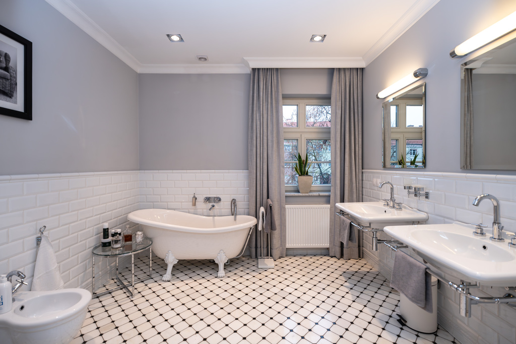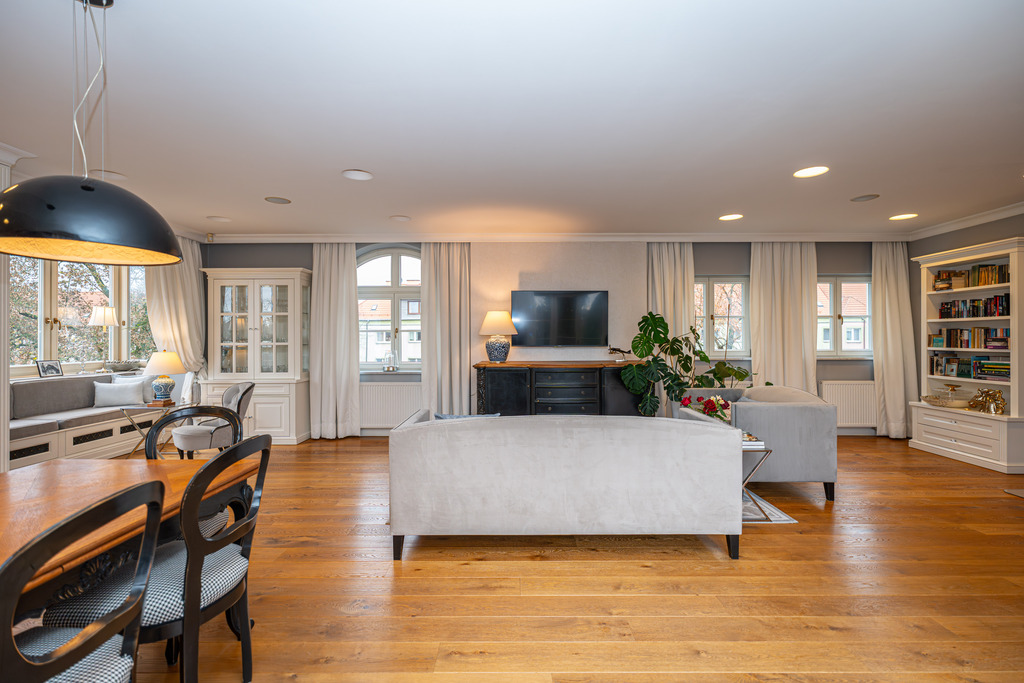To wnętrze, które zachwyca dbałością o detal i ponadczasową klasą. Dominuje piękna, olejowana deska dębowa na podłogach, wysokie listwy przypodłogowe, sztukaterie ścienne i sufitowe, klasyczne proporcje pomieszczeń. Szaro-beżowa paleta barw przełamana głęboką zielenią i czernią, welurowe sofy, żyrandole w stylu glamour, kominek wolnostojący w salonie. Kuchnia otwarta na jadalnię w bieli i drewnie,. Łazienki wykończone marmurem i mozaiką w stylu retro (wanna wolnostojąca na lwich łapach,  baterie w chromie.