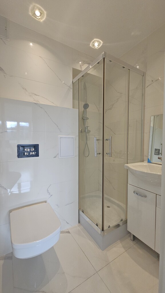 - Łazienka z WC – 2,37 m². Wykończona w modnych płytkach, wyposażona w kabinę prysznicową oraz WC w zabudowie. Brakuje jedynie przycisku spłuczki — zostanie uzupełniony przed sprzedażą.