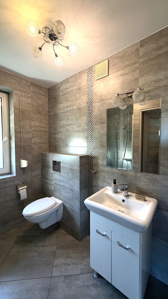Łazienka oraz kotłownia z nowoczesną pompą ciepła.