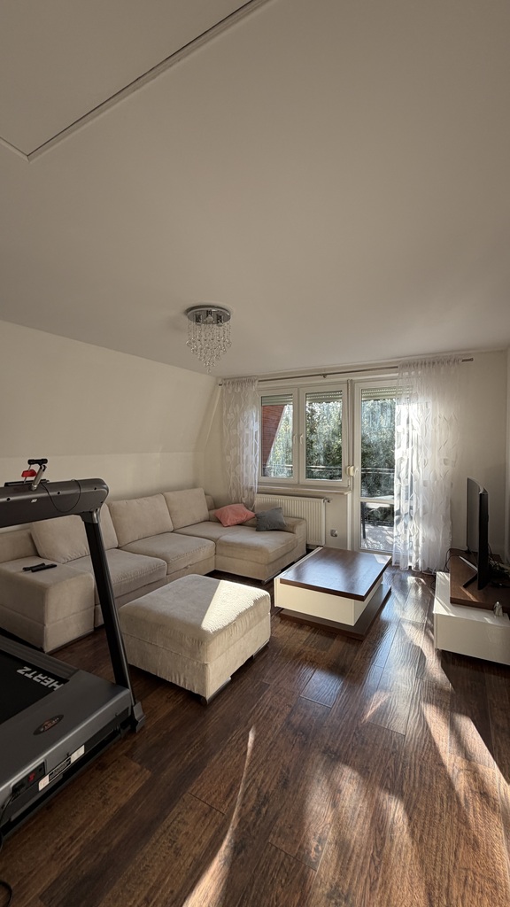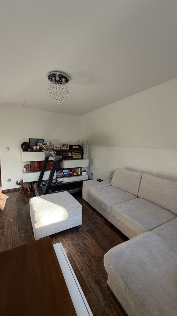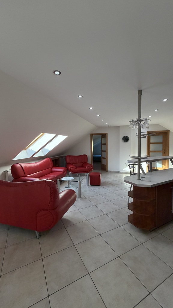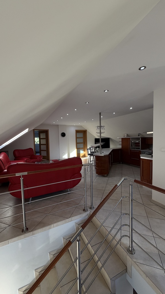 * Część mieszkalna (Poddasze - ok. 70 m²): Przestronny salon z aneksem kuchennym, 2 ustawne sypialnie oraz łazienka. Wnętrza gotowe do zamieszkania.