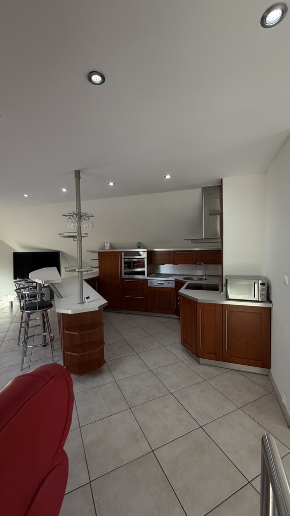 * Kuchnia: Wyposażona w kamienne blaty i zabudowany sprzęt AGD.