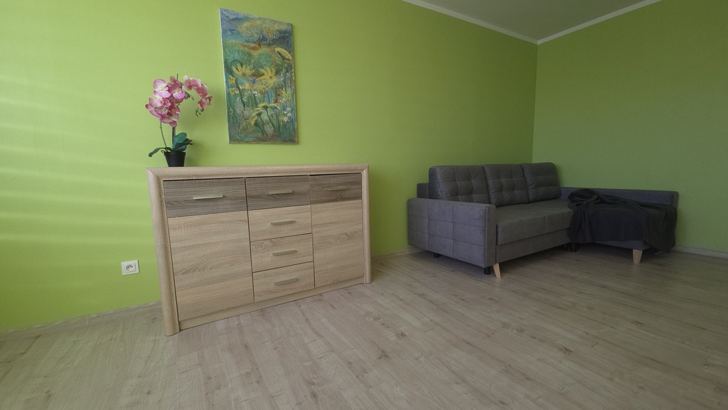 • Salon wyposażony w rozkładaną kanapę, komodę oraz stół z 2 fotelami.