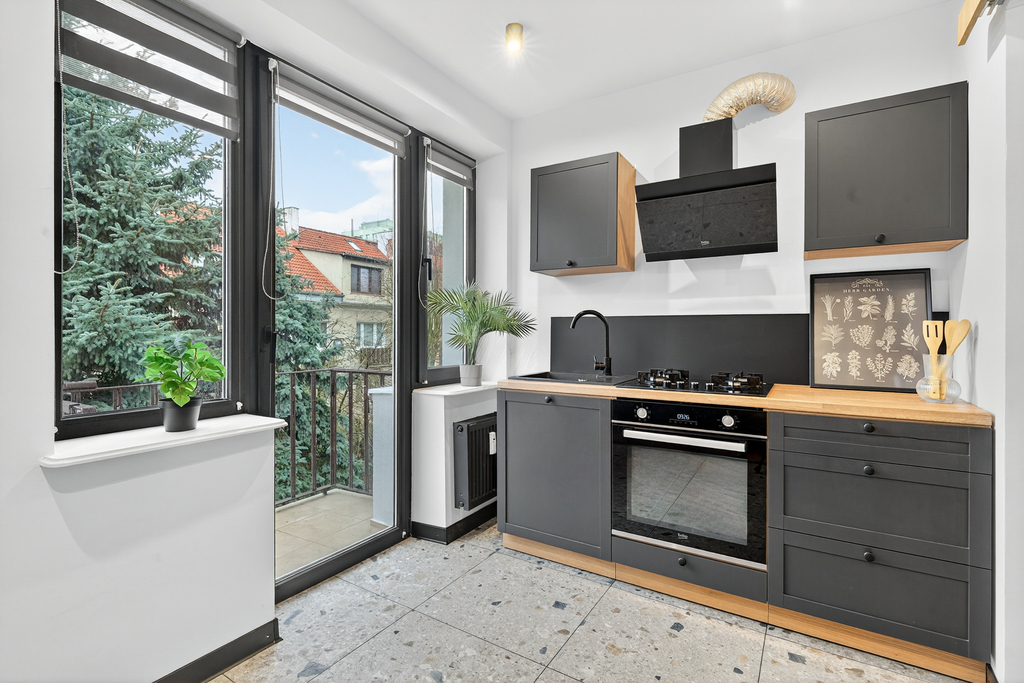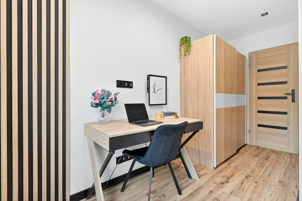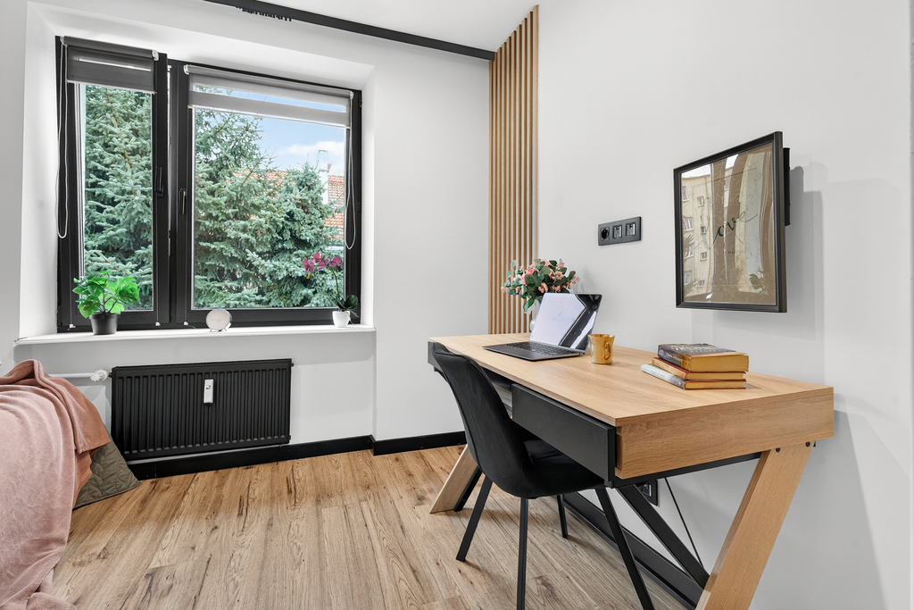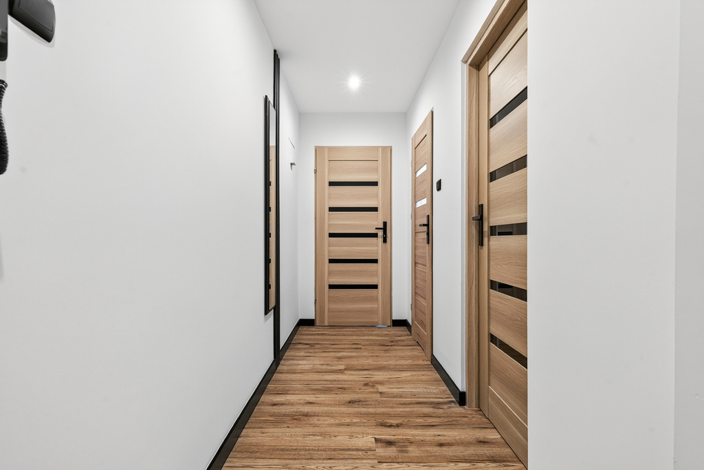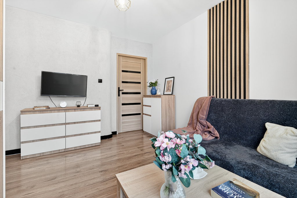 Mieszkanie przeszło kapitalny remont i jest kompletnie odświeżone: nowe instalacje, panele drewnopodobne, drzwi oraz nowoczesne wykończenie wszystkich pomieszczeń w spójnej kolorystyce (biel, drewno, grafit).