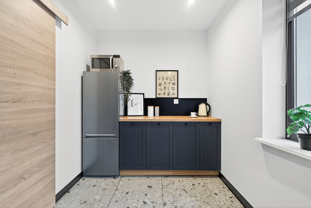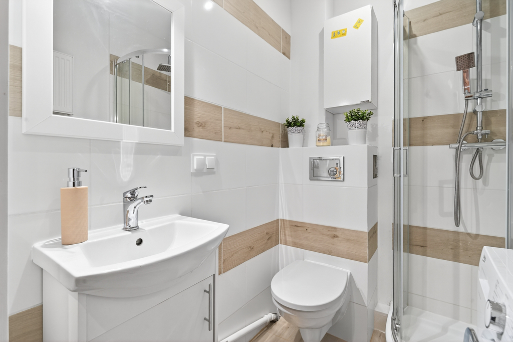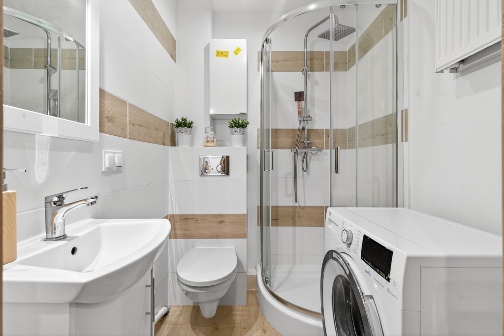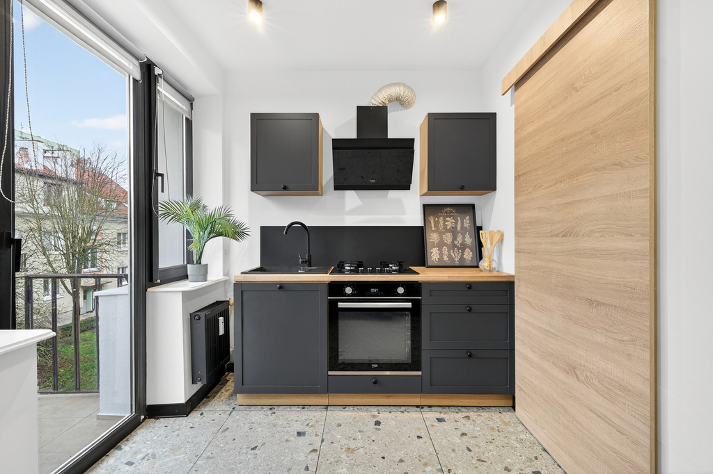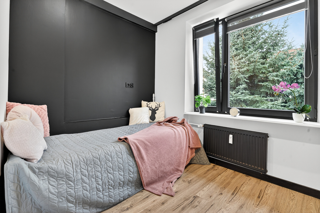 Mieszkanie przeszło kapitalny remont i jest kompletnie odświeżone: nowe instalacje, panele drewnopodobne, drzwi oraz nowoczesne wykończenie wszystkich pomieszczeń w spójnej kolorystyce (biel, drewno, grafit).