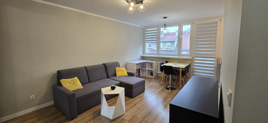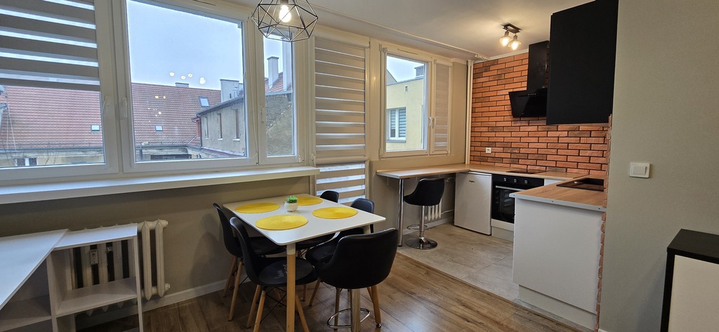 Wnetrze urządzone w nowoczesmym stylu, składa się z przestronnego pokoju dziennego, otwartej kichni, łazienki z prysznicem oraz przedpokoju. Kuchnia wyposażona w sprzęt AGD,: lodówkę, zmywarkę, piekarnik, okap, plytę indukcyjną. W pokoju jest strefa wypoczynkowa oraz jadalniana, a na ubrania zainstalowano bardzo pojemną szafę. Mieszkanie posiada wyjście na malutki balkon od strony podwórza.