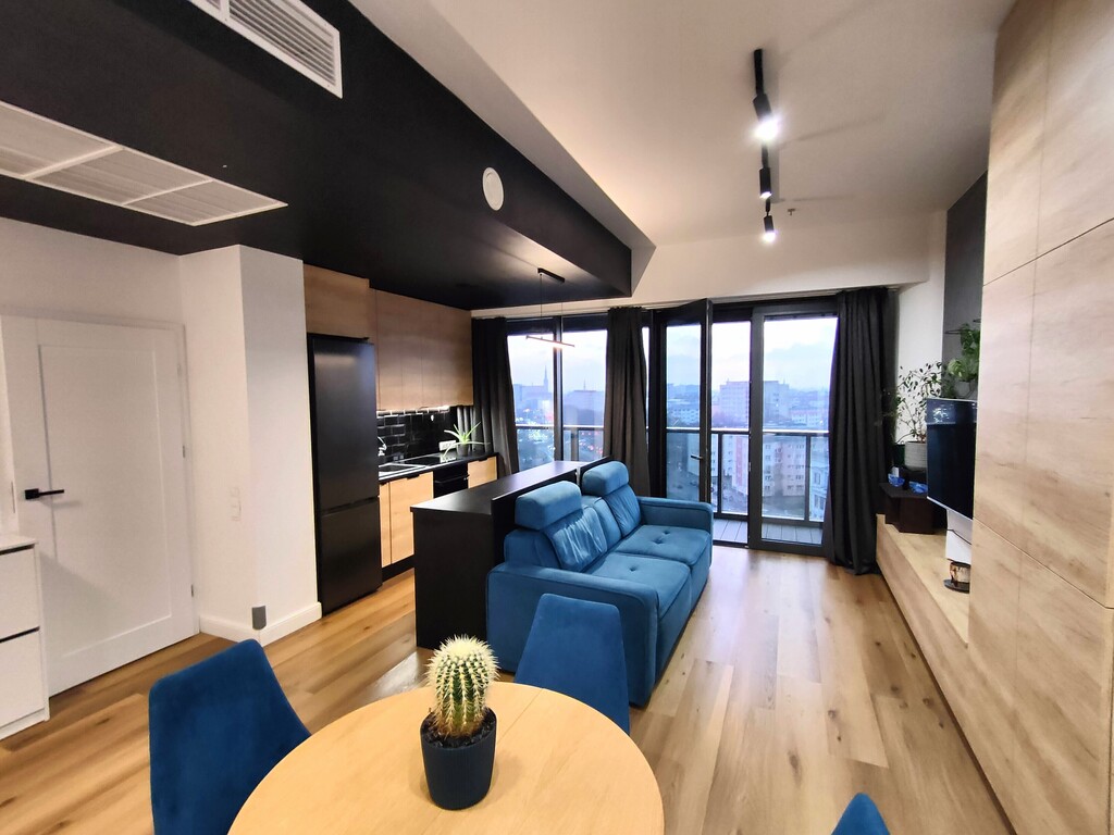 Apartament wykończony w nowoczesnym, spójnym stylu, z wykorzystaniem materiałów wysokiej jakości. Jasny salon połączony z aneksem kuchennym tworzy komfortową, dobrze doświetloną przestrzeń dzienną. Duże przeszklenia prowadzą na loggię i zapewniają atrakcyjny widok na centrum miasta.