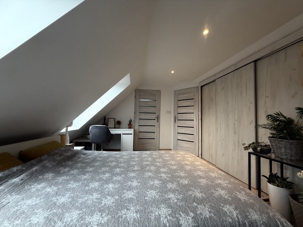 Na drugim piętrze znajduje się duża sypialnia z szeroką szafą i garderobą.