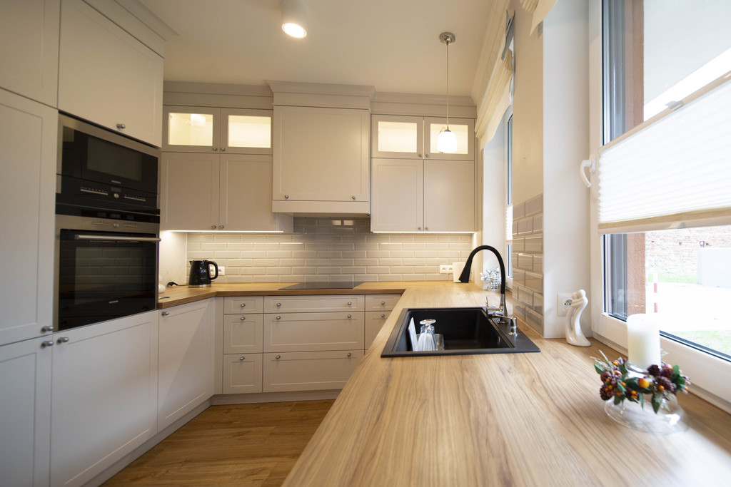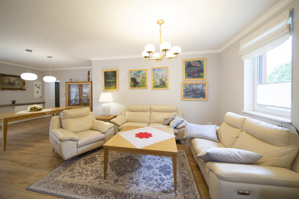 - Jasny, przestronny salon z aneksem kuchennym z bezpośrednim wyjściem na niewielki taras