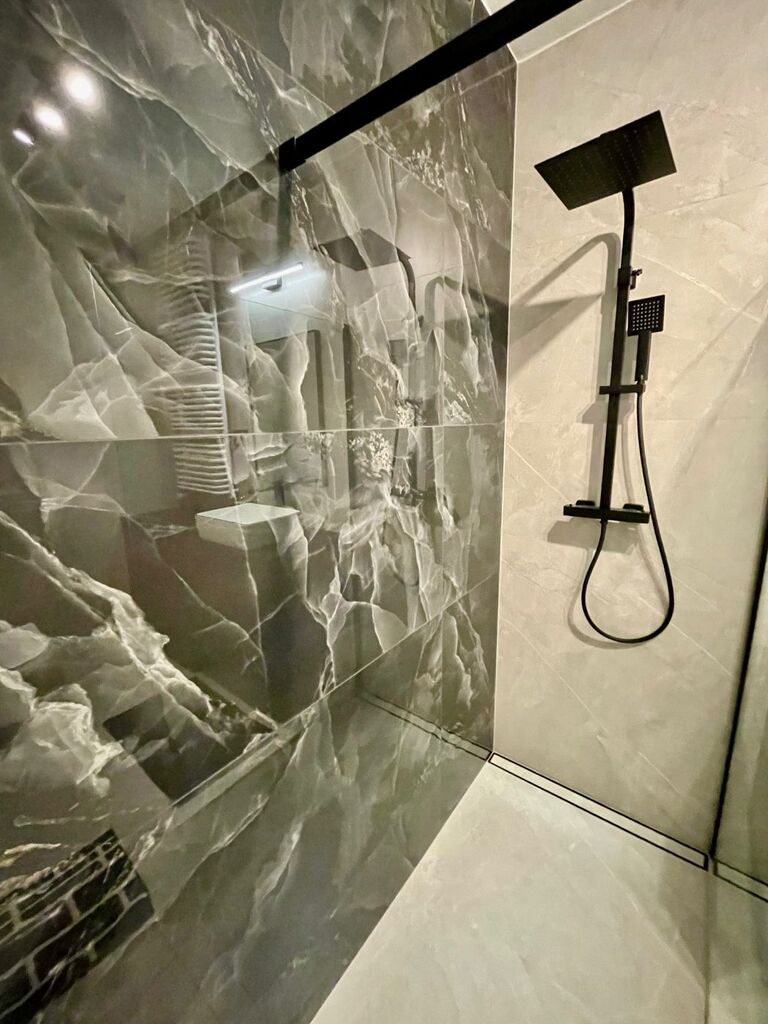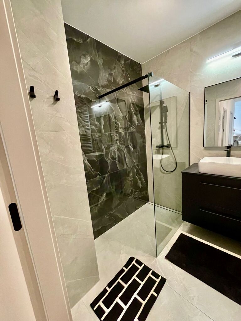 Łazienka przestronna, wyposażona między innymi w przeszkloną, bezprogową kabinę prysznicową, WC, umywalkę oraz pralkę.
