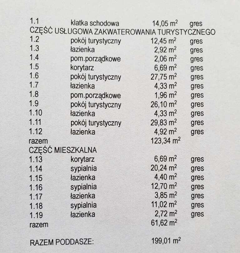 1. piętro – 199,01 m² - 7. pokoi z łazienkami, pomieszczenie gospodarcze.