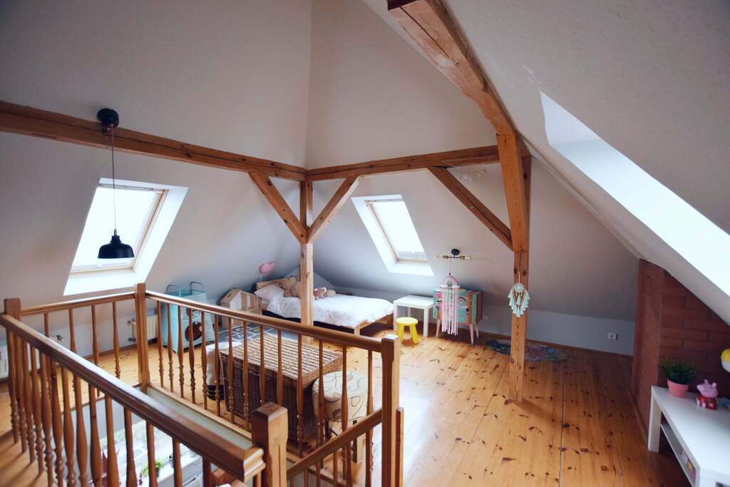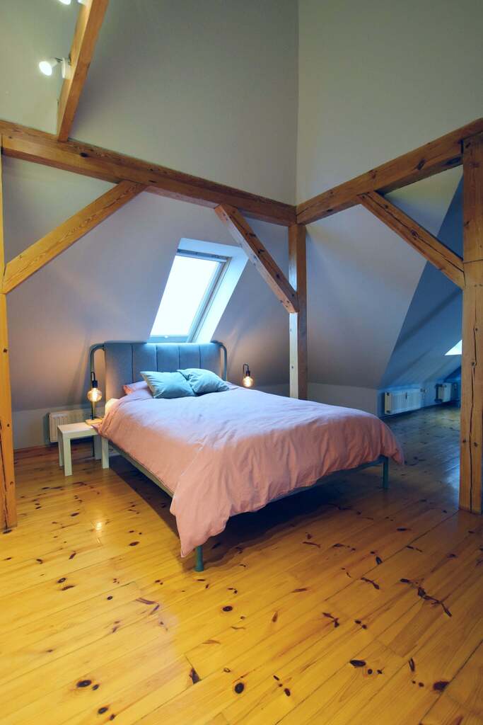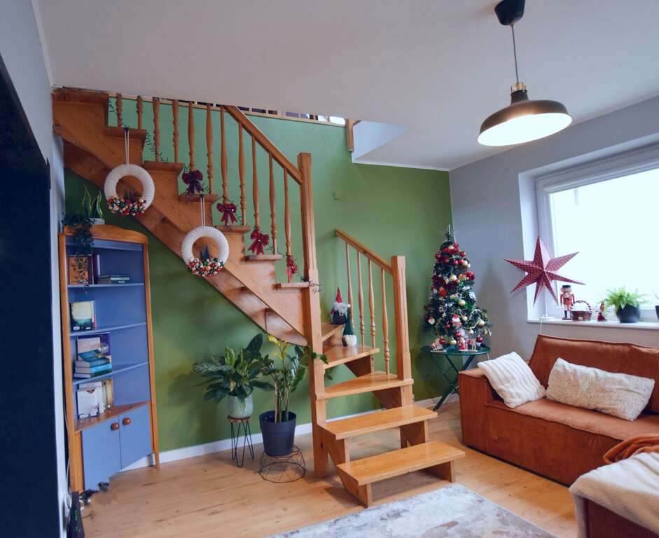 duża, wysoka przestrzeń open space – obecnie jako strefa dzieci, z możliwością wydzielenia dwóch dodatkowych pokoi, co daje łącznie nawet 4 pokoje. Ta część mieszkania nadaje wnętrzu charakter domu jednorodzinnego.
