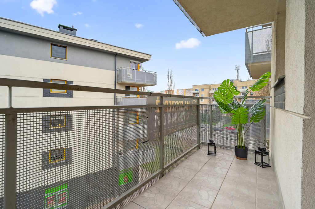 • Balkon: Do mieszkania przynależy duży, szeroki balkon, ciągnący się wzdłuż elewacji, zapewniający dodatkową przestrzeń użytkową.