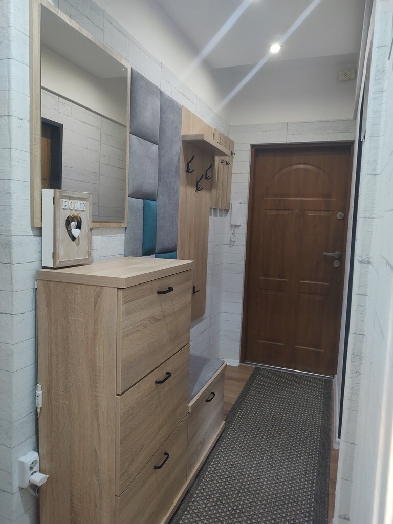 - przedpokój - panele, ściany malowane i tapeta,