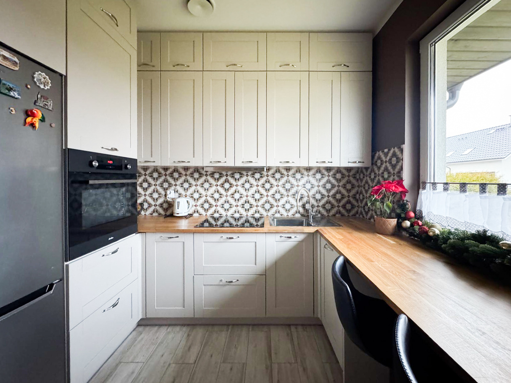 - kuchnia z nową zabudową, o bardzo atrakcyjnym stylu i kolorze z małą, ale jakże niezbędną spiżarnią,