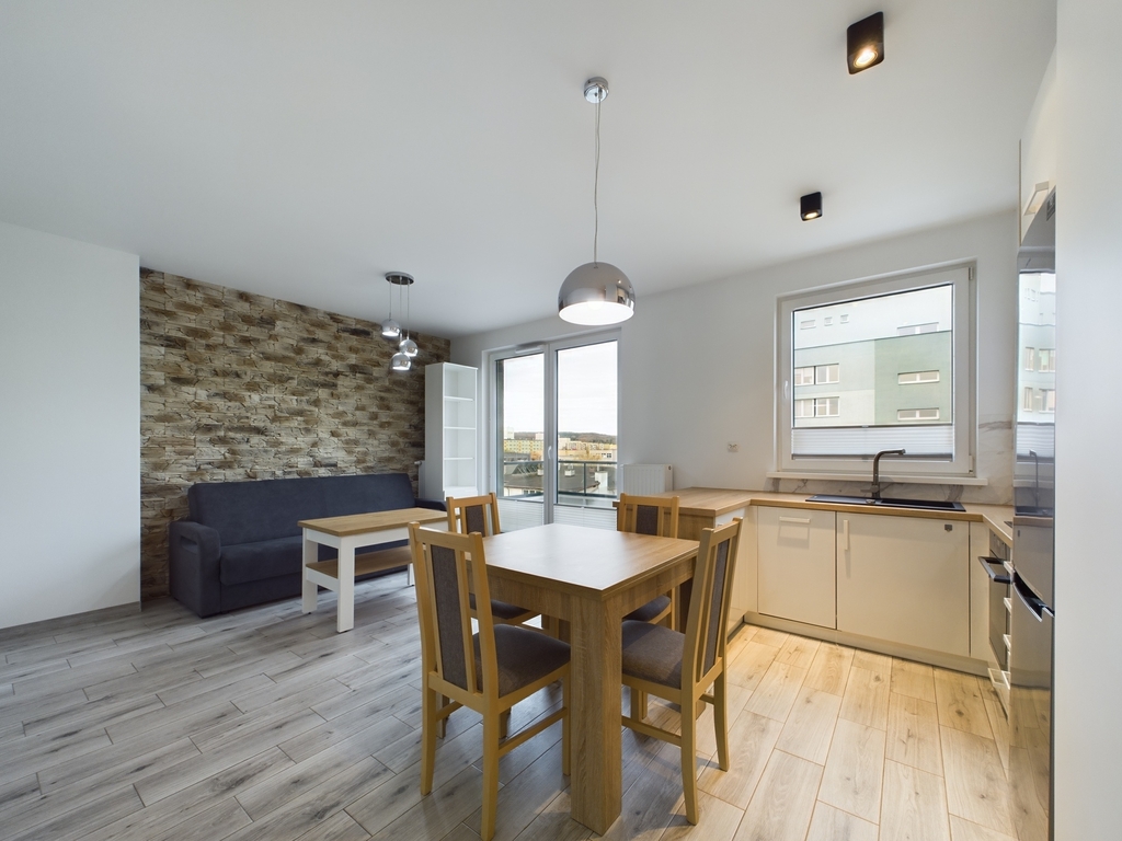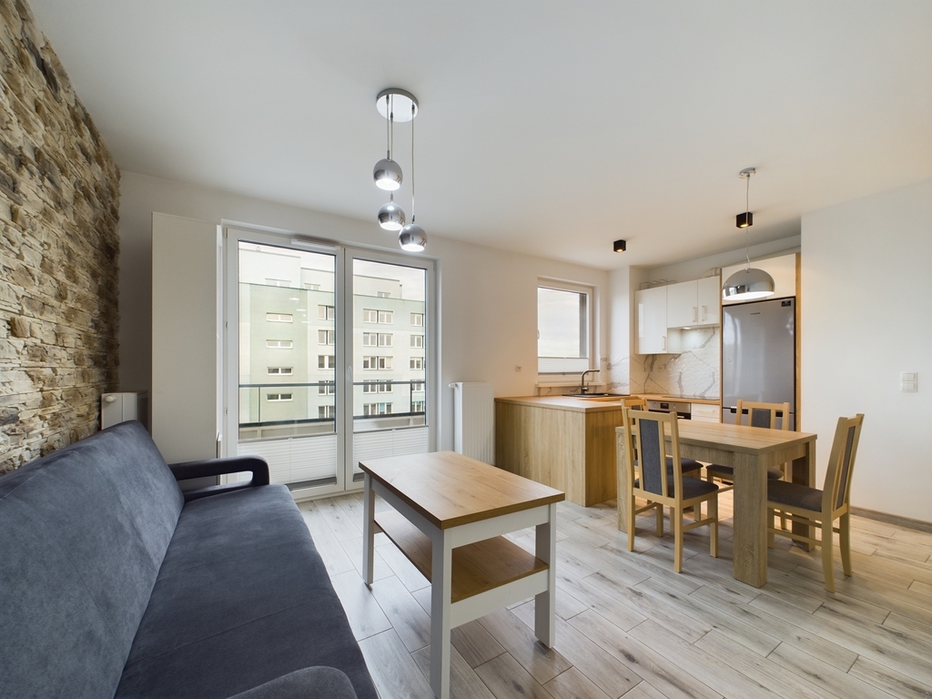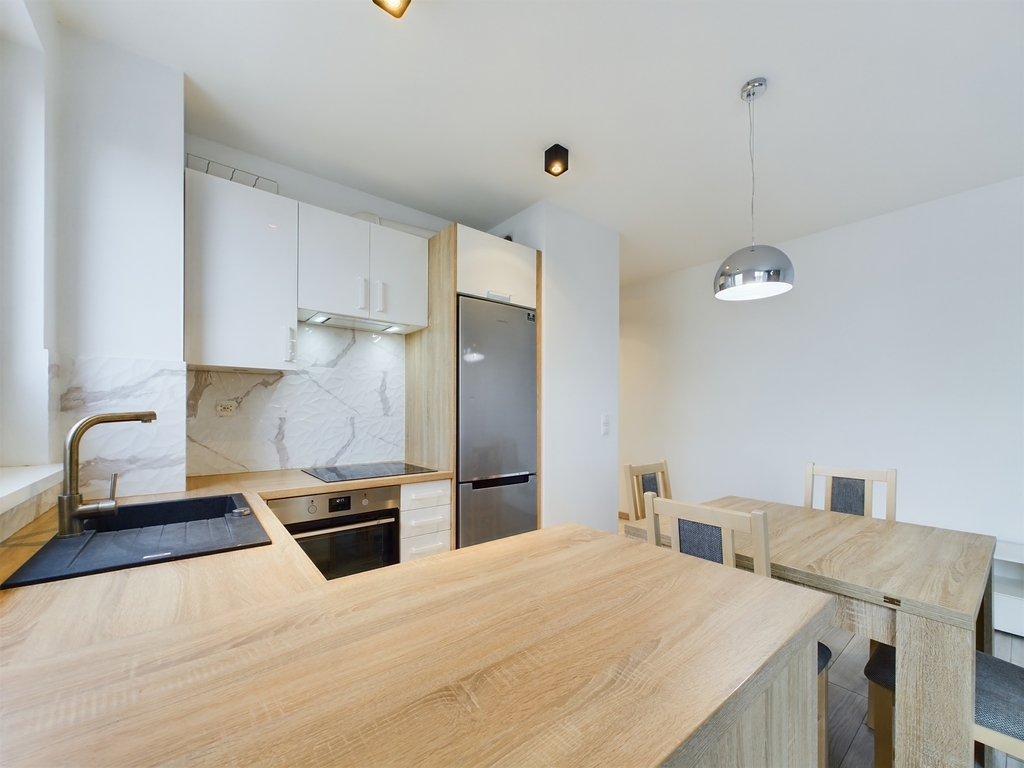 - przestronny salon z aneksem kuchennym wyposażonym w płytę, piekarnik, zmywarkę, lodówkę, zlew, okap i meble na wymiar, z którego mamy bezpośrednie wyjście na balkon. W salonie znajduje się rozkładana kanapa, komoda, telewizor oraz stół + 4 krzesła