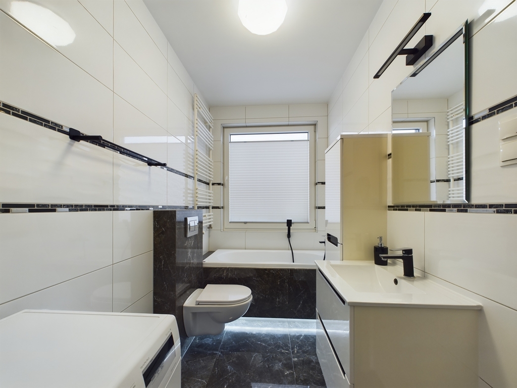 - łazienka z wanną, umywalką z szafką, WC i pralką