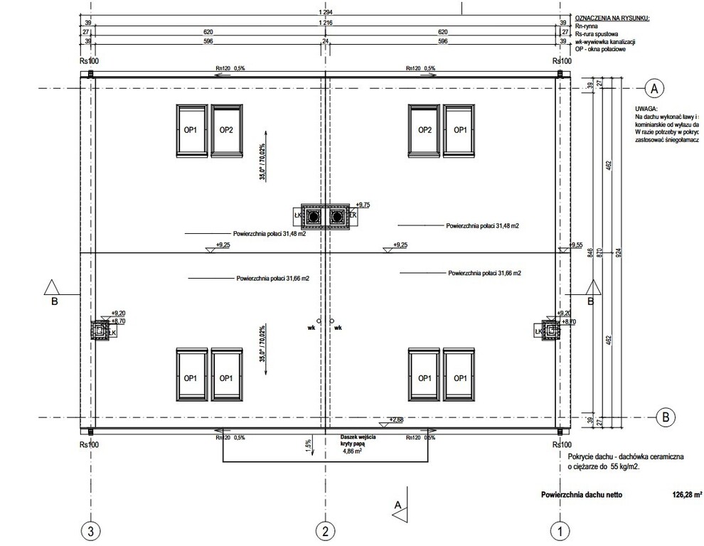 Dach: więźba dachowa drewniana, dachówka ceramiczna, rynny PCV, obróbki blacharskie z blachy stalowej ocynkowanej lub cynkowej