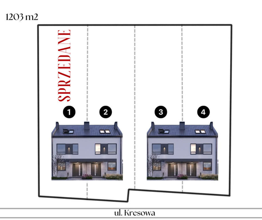 Docelowo inwestycja składać się będzie z dwóch domów w zabudowie szeregowej po 2 segmenty. (Łącznie 4 szeregowce).