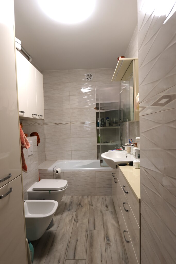 - łazienka - glazura, terakota, wanna z szybą, wc, bidet, umywalka, duża szafa, w której mieszczą się piec gazowy, pralka, suszarka,