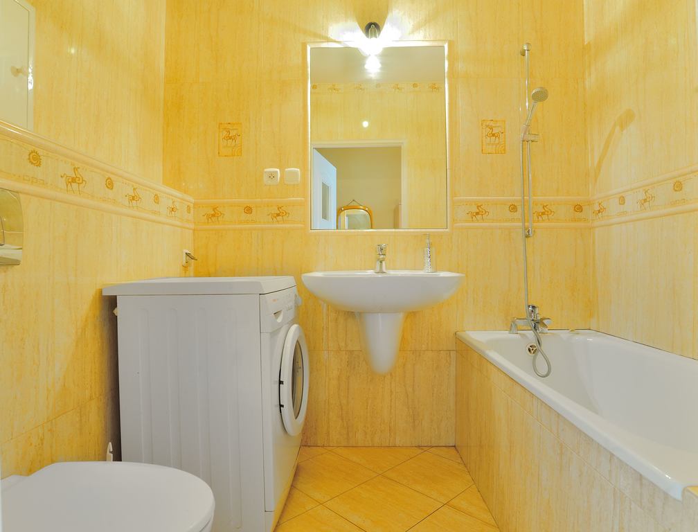 Łazienka wyposażona w wannę, umywalkę, wc i pralkę; na ścianach glazura nowego typu. Pokój umeblowany w dwie komody, narożnik, fotel, ławę, szafkę oraz regał (widoczne na zdjęciach).