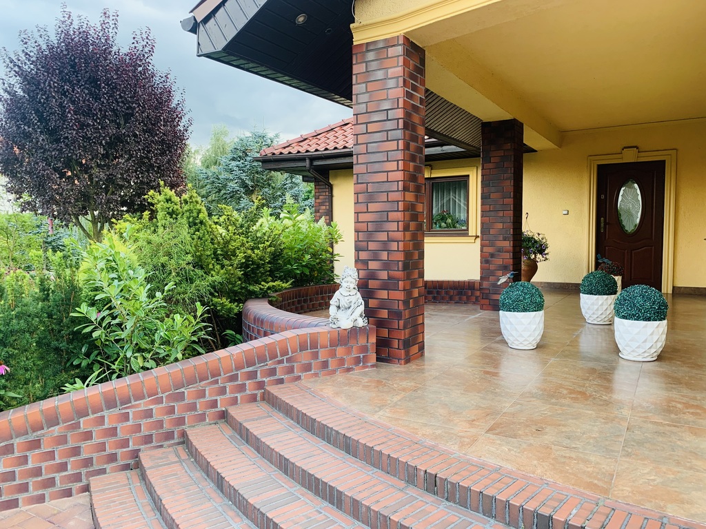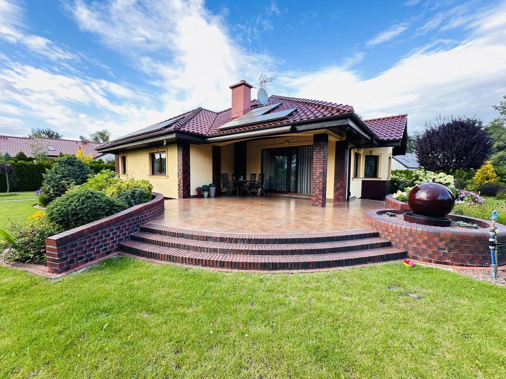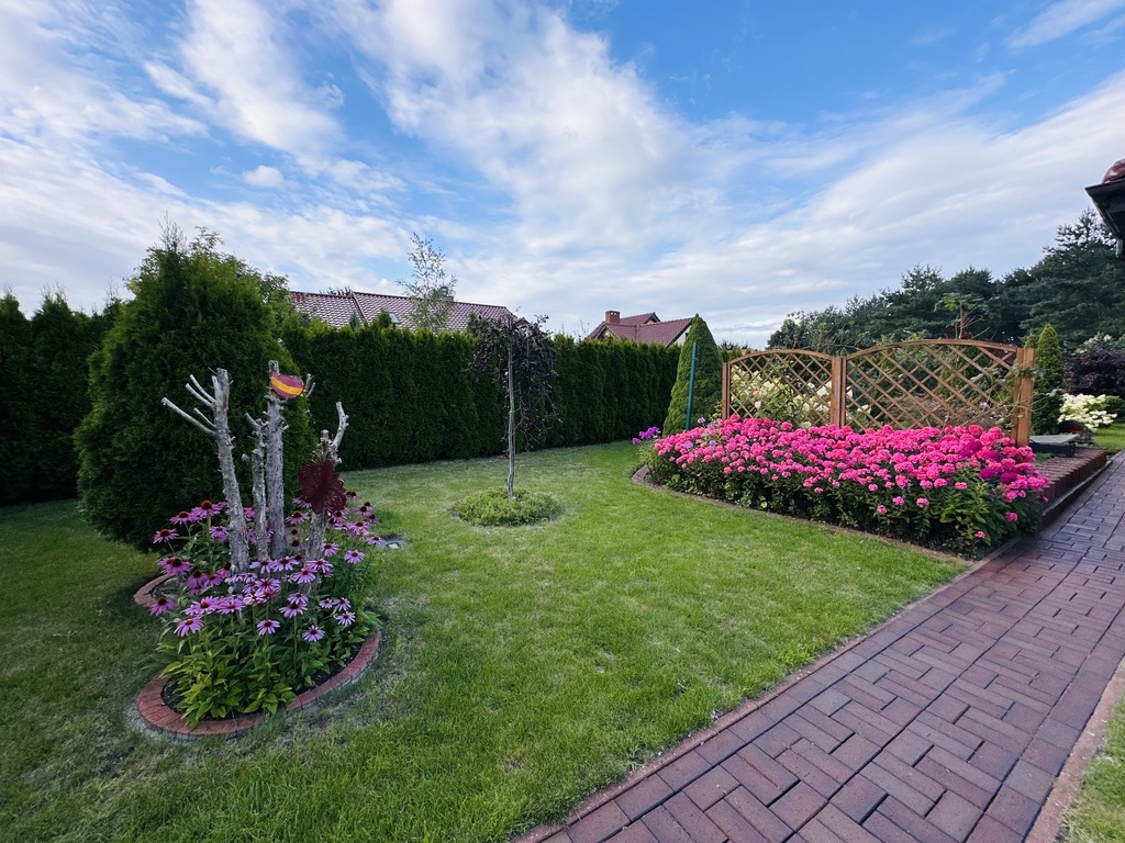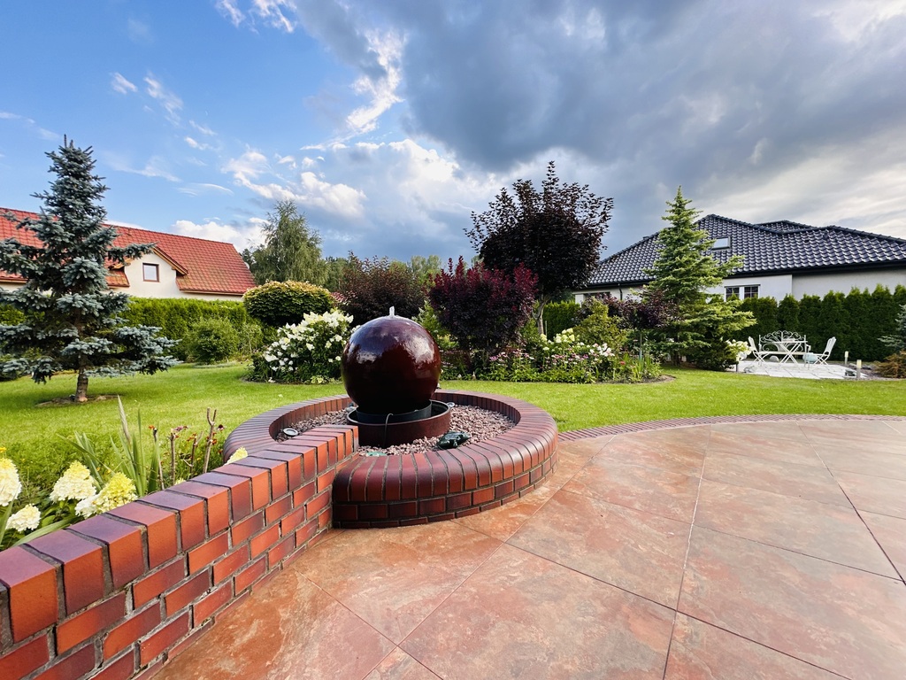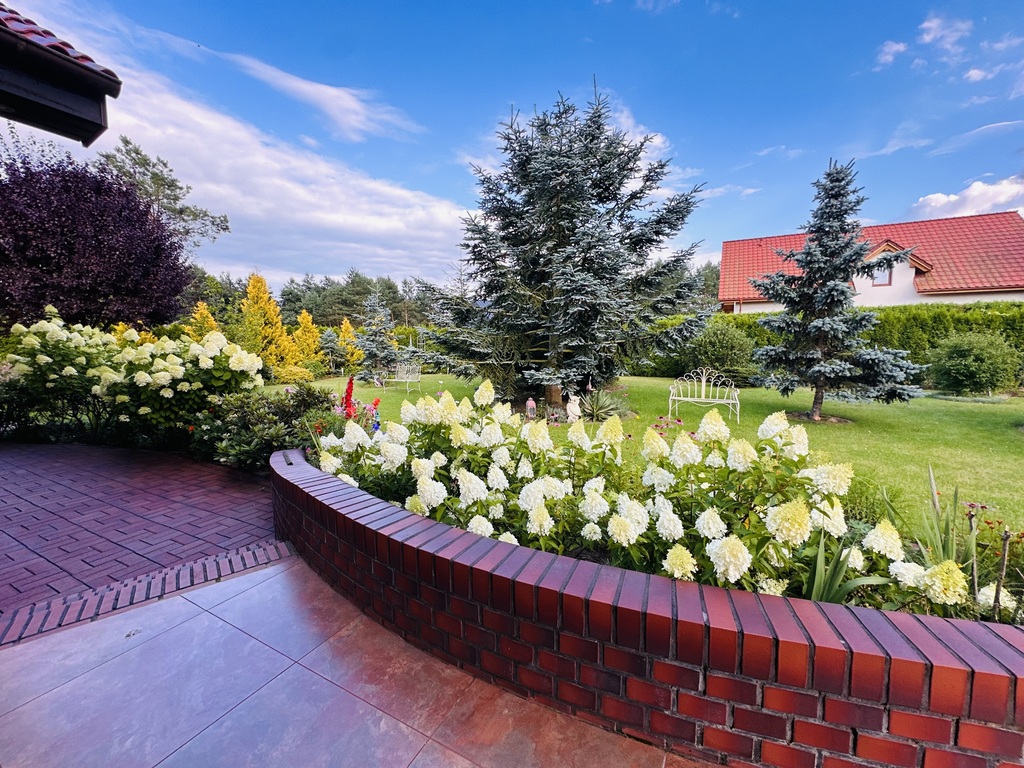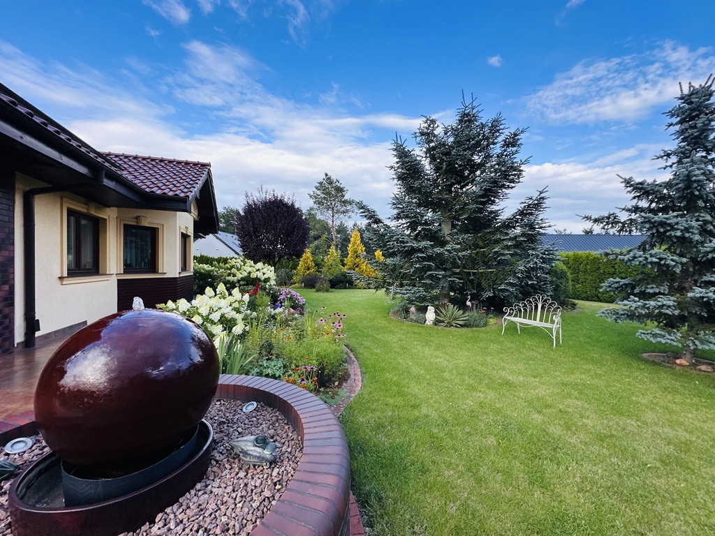 Pięknie zagospodarowany ogród o powierzchni 1400 m² z oryginalną architekturą ogrodową: pergolą, fontanną, drewnianą altaną z antresolą , tarasem rekreacyjnym.