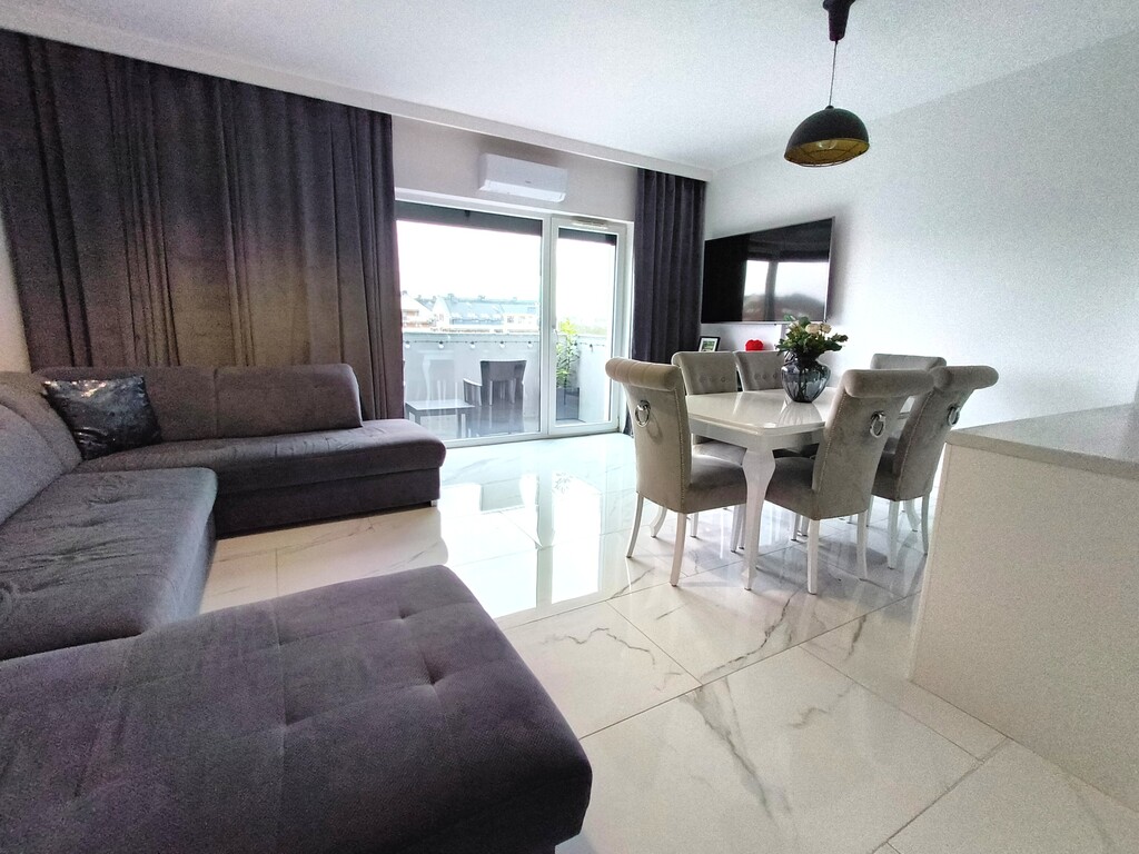 Mieszkanie zostało wykończone w bardzo wysokim standardzie, z dbałością o detale i funkcjonalny układ pomieszczeń. Dzięki trójstronnej ekspozycji (południe–wschód–zachód) wnętrza są doskonale doświetlone przez cały dzień.