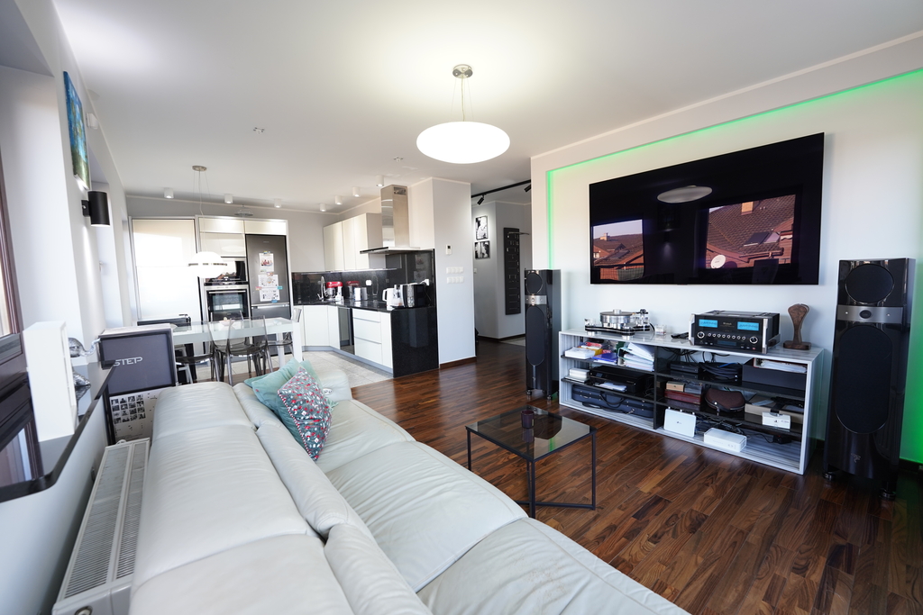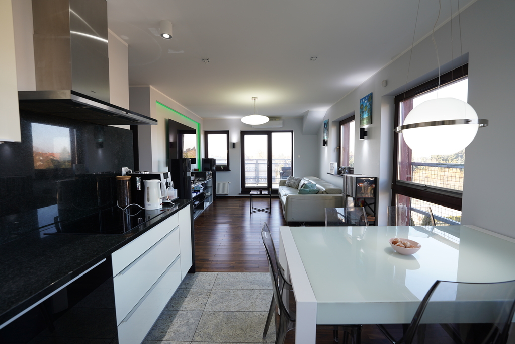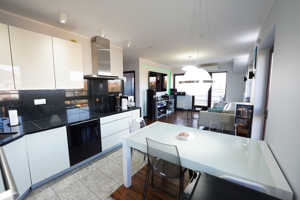 Mieszkanie o wysokim standardzie, wykończone materiałami najwyższej jakości, takimi jak granitowe podłogi, parapety, blaty, elementy wyposażenia, podłogi z drewna palisander, szafy w zabudowie.