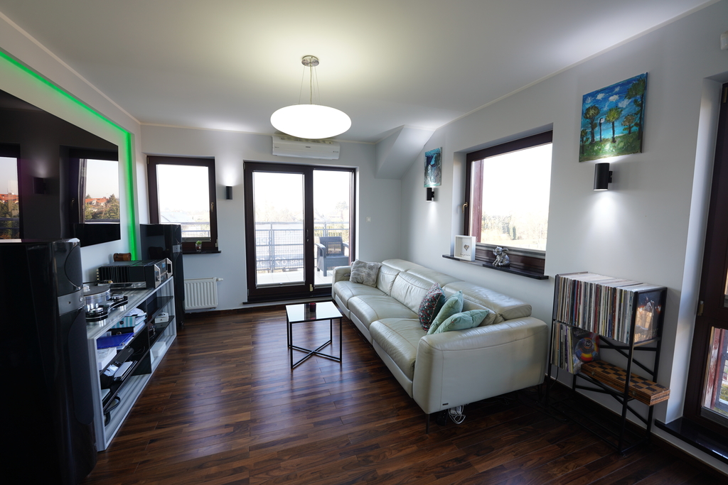 - pomieszczenie strychowe z bezpośrednim wejściem z mieszkania (po podłodze ok. 50 m², ok. 10 m² powierzchni użytkowej), możliwość zaadaptowania na dodatkowy pokój, pomieszczenie jest docieplone, ściany wykończone regipsami, na podłodze panele,
