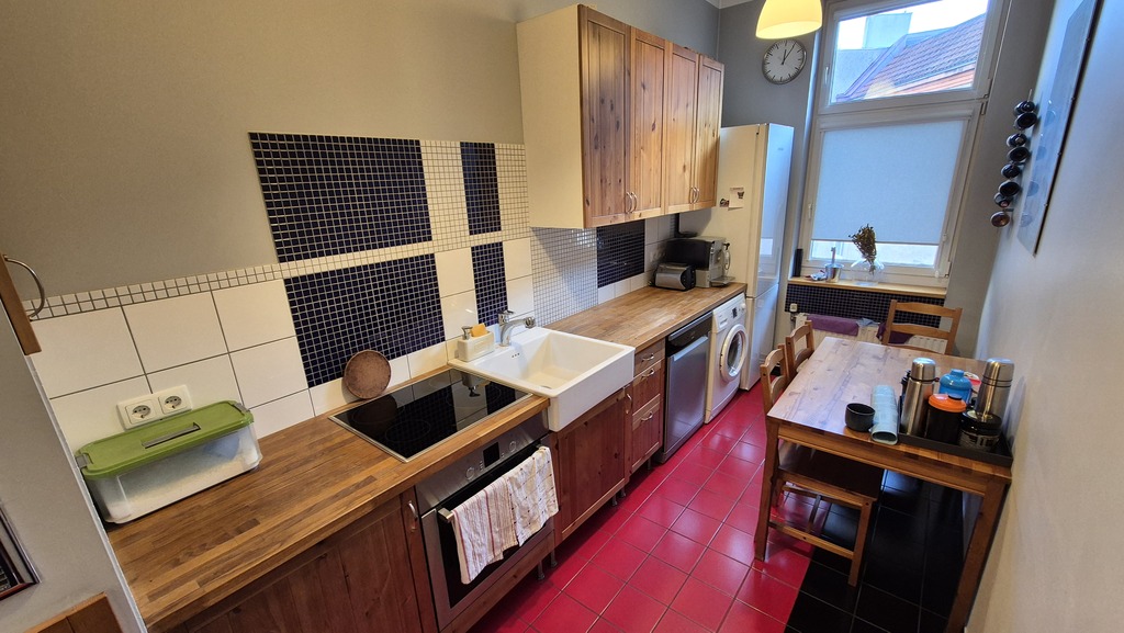 -kuchnia 9,3 m2 (kuchnia wyposażona w sprzęt AGD - lodówka, piekarnik, płyta indukcyjna, pralka, zmywarka),