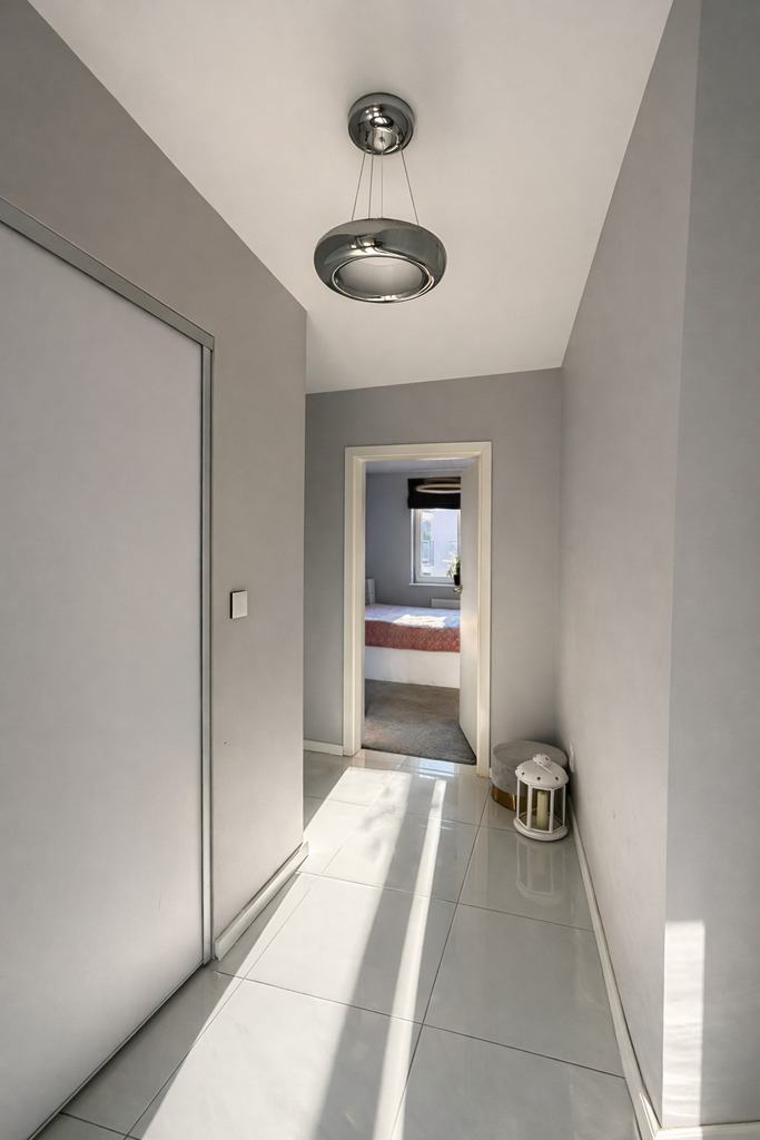 Dwie niezależne sypialnie zapewniają komfort i intymność domownikom, a oddzielna garderoba podkreśla apartamentowy charakter nieruchomości. Elegancka łazienka oraz starannie zaprojektowany przedpokój dopełniają całości, tworząc wnętrze dopracowane w każdym detalu.