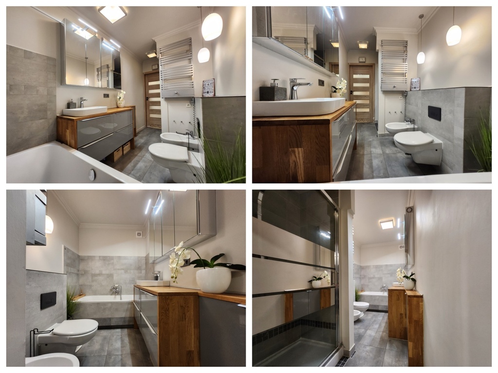 Łazienka spora wyposażona w wannę, kabinę prysznicową WC oraz bidet, wykończona gustownymi kaflami.