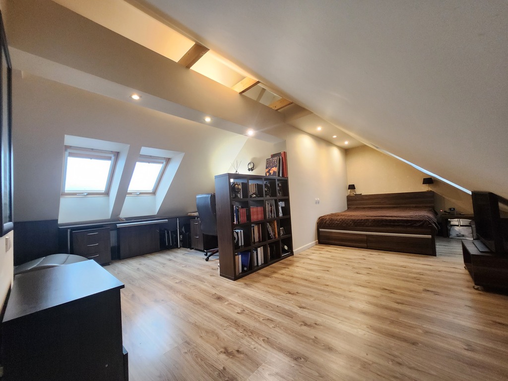 Na drugim poziomie znajduje się duża przestrzeń gdzie znajduje się sypialnia z garderobą oraz część przeznaczona na gabinet.