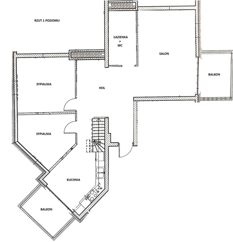 Na pierwszym znajdują się spory salon o pow. ok. 23 m2 w wyjściem na balkon, dwie sypialnie, kuchnia z wyjściem na balkon, łazienka z WC oraz duży hol z szafami w zabudowie.