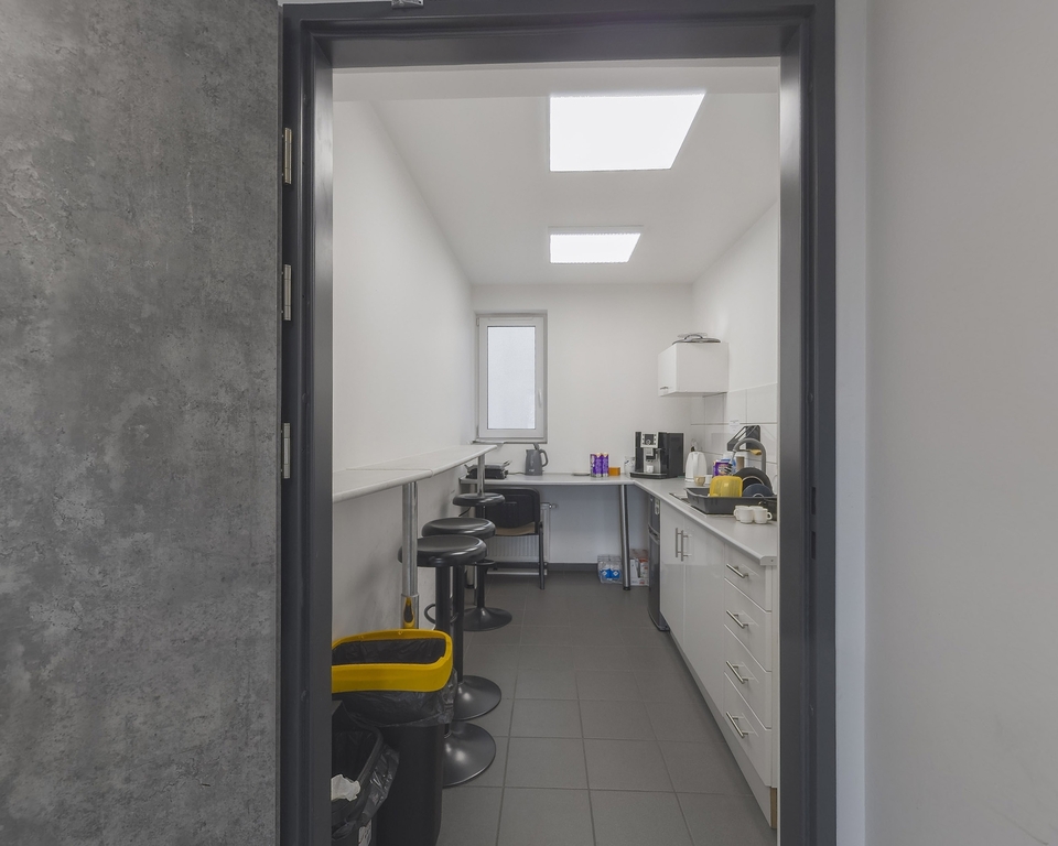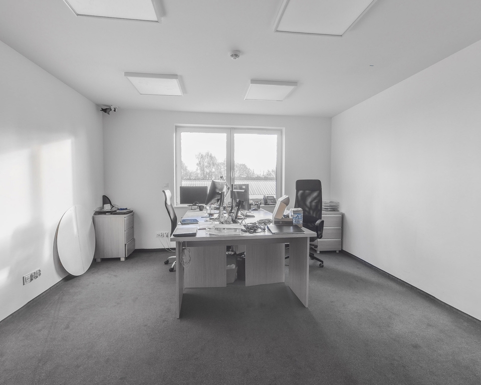 Jasne pokoje biurowe z dużymi oknami zapewniającymi dostęp światła dziennego.