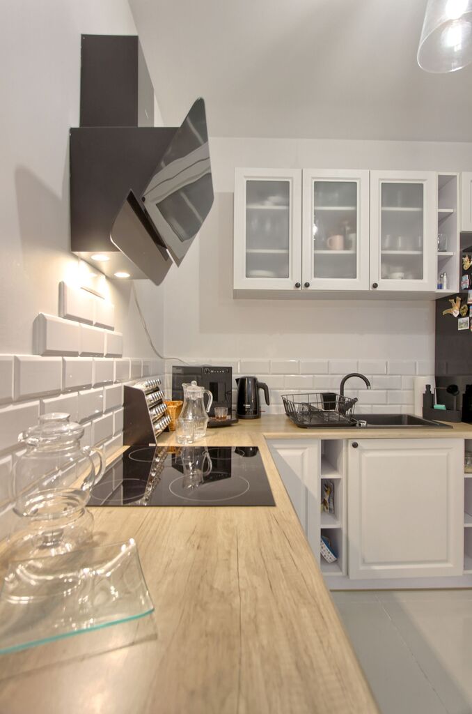Aneks kuchenny wyposażony w meble w stałej zabudowie oraz sprzęt agd.