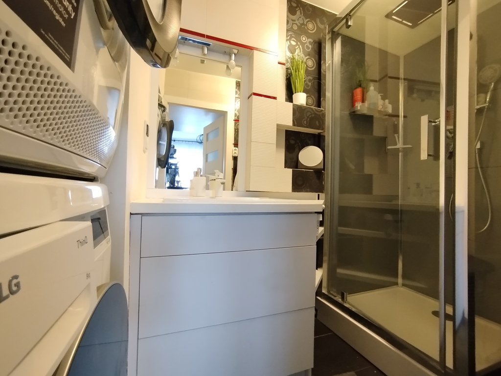 które mogą pełnić dowolną funkcje. Łazienka z kabina prysznicowa pralką i suszarką  oraz osobne WC .