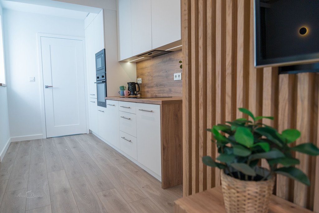 • pełne wyposażenie kuchni (zabudowa meblowa, piekarnik, zmywarka, kuchenka mikrofalowa, płyta indukcyjna )